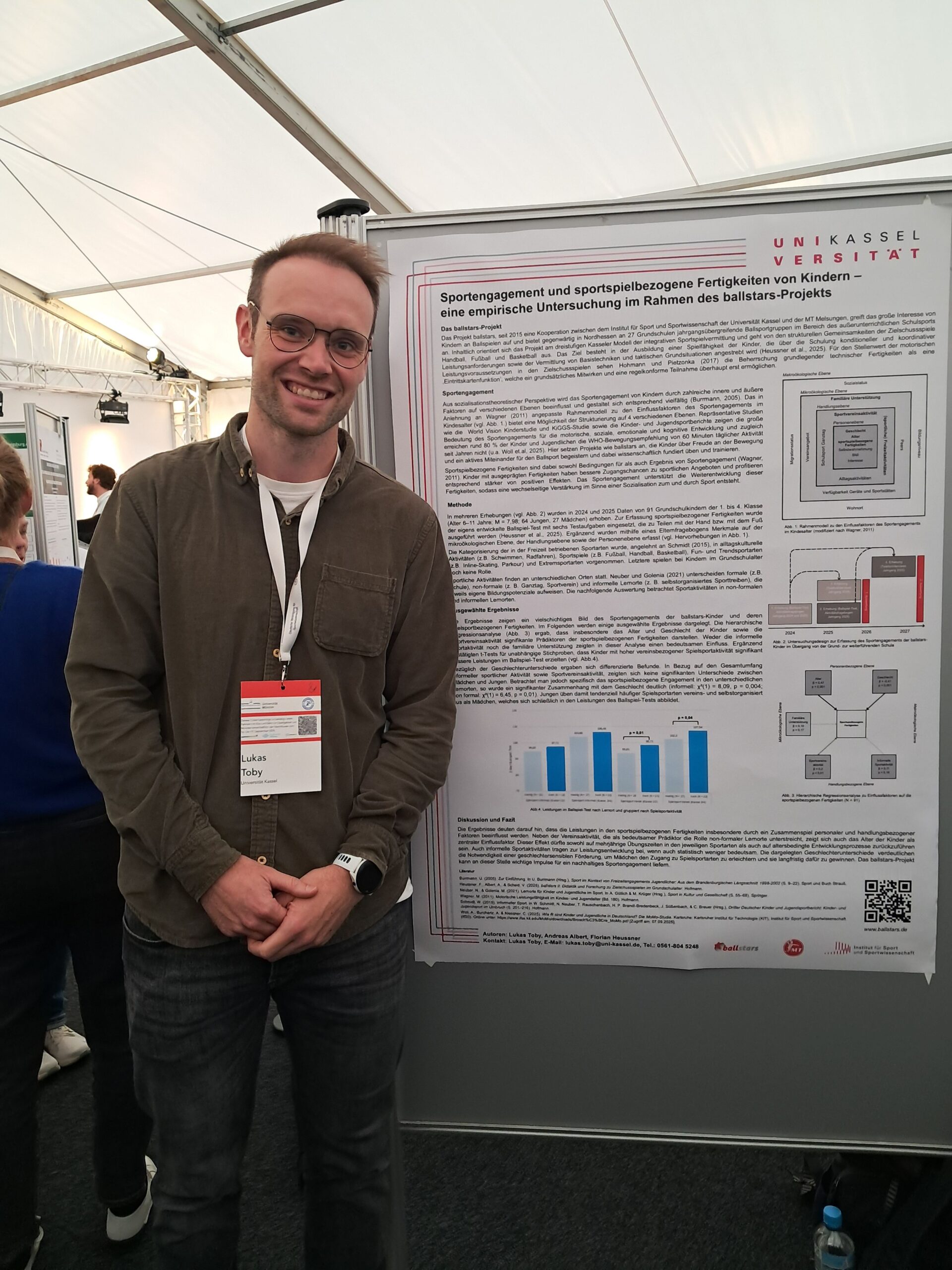 Vom 16. bis 19. September 2025 fand in Münster der 27. sportwissenschaftliche Hochschultag der Deutschen Vereinigung für Sportwissenschaft (dvs) unter dem Leitmotiv „Sportwissenschaft: Vielfalt und Nachhaltigkeit!?“ statt. Das ballstars-Projekt war mit einem Poster vertreten. Dabei wurden nicht nur das Projekt und seine theoretischen Grundlagen vorgestellt, sondern auch das Forschungsdesign der aktuellen Studie sowie erste ausgewählte Ergebnisse präsentiert. Darüber hinaus bot der Hochschultag ein vielfältiges Programm mit spannenden Arbeitskreisen, Symposien, Keynotes und Dialogforen – unter anderem zu Themen wie Talentförderung, familiärer Unterstützung und Sportaktivität, informellem Sporttreiben sowie Themen rund um den Ganztag. Viele dieser Forschungsbeiträge liefern wichtige Anknüpfungspunkte für die laufende ballstars-Studie.